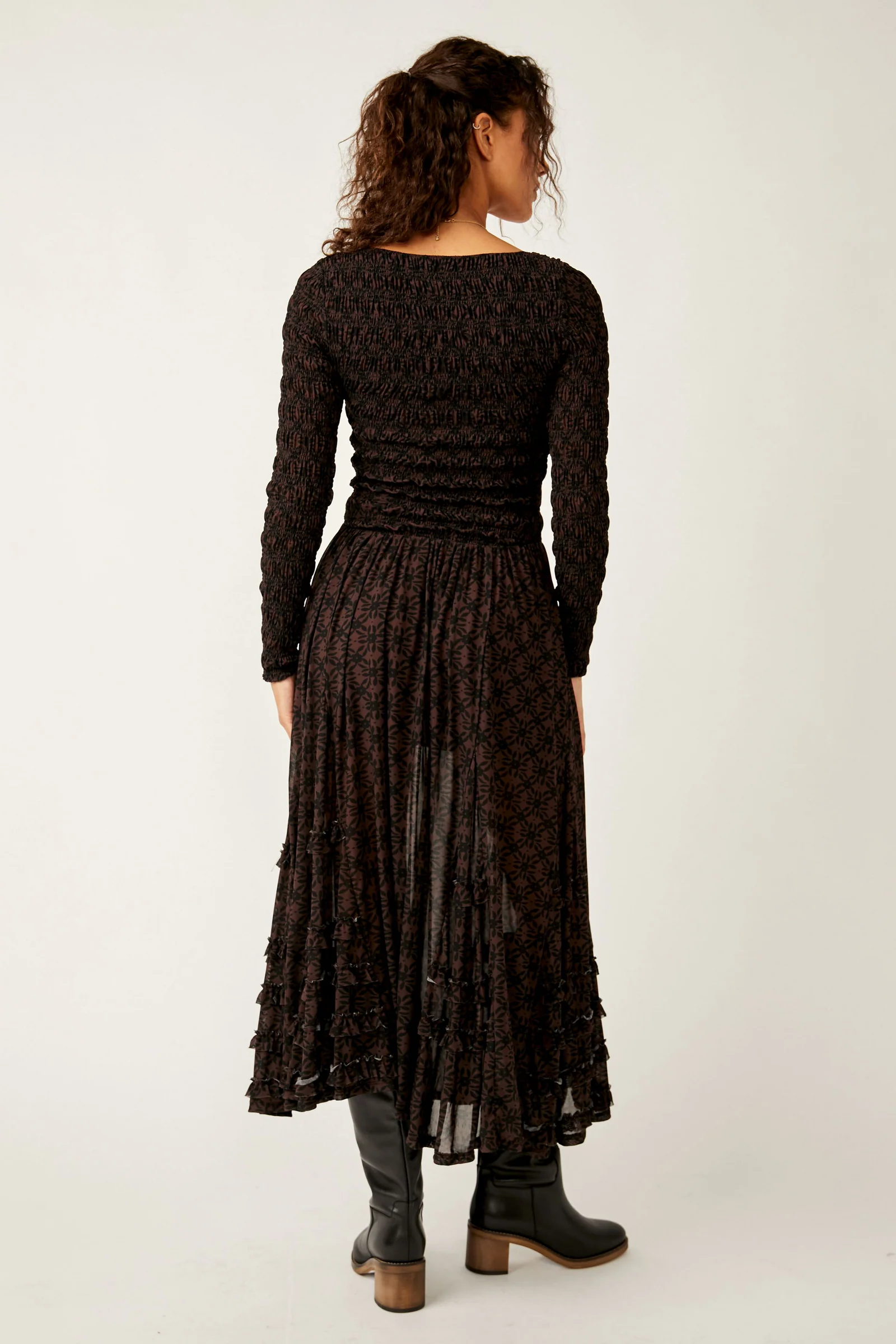 Features: Scoop neckline, smocking at top, ¾ length sleeves, slightly dropped waist, pleating at bottom, semi-sheer bottom, ruffle detailing at bottom
